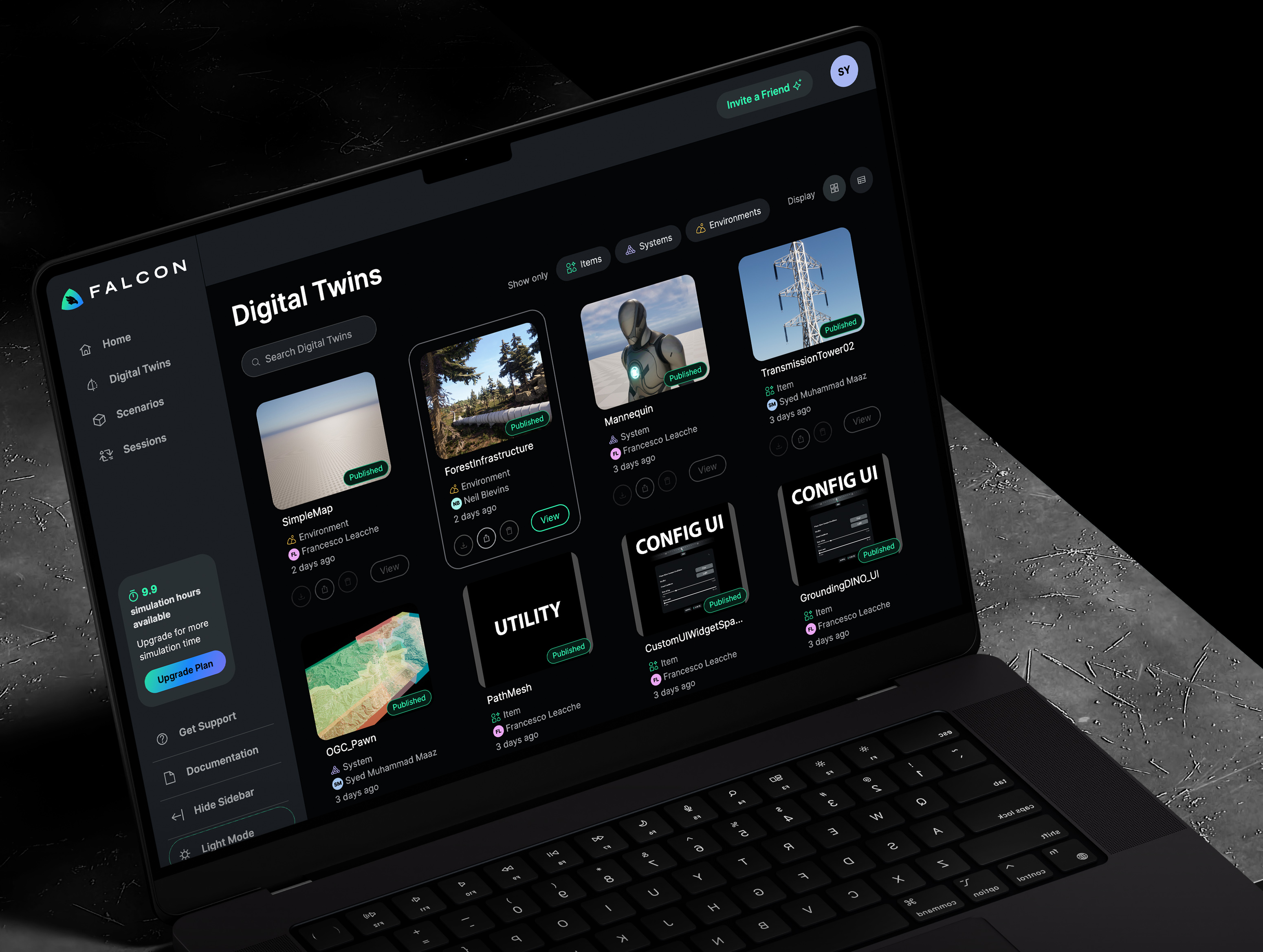 Falcon Cloud is a SaaS B2B platform that empowers anyone to solve complex engineering problems, generate high-fidelity data, and predictive behavior modeling by acquiring, managing, and simulating digital twins of real-world scenarios.